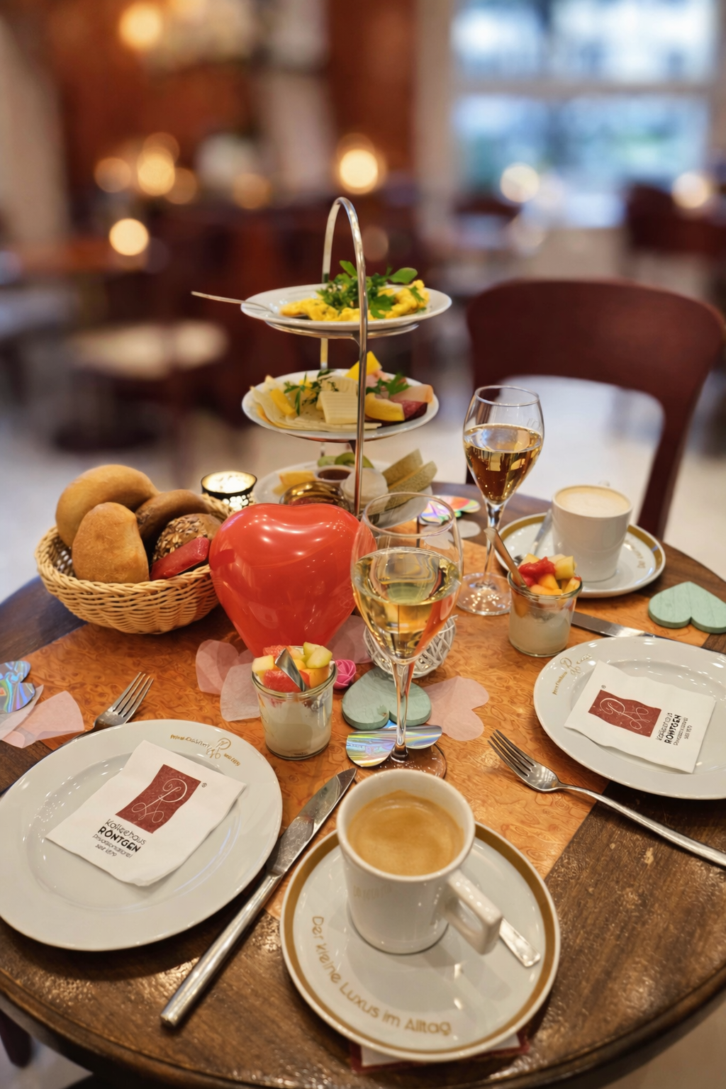 Genießen Sie ein liebevoll arrangiertes Valentinstags-Frühstück für zwei: herzhafte Wurst- und Käseauswahl, Hauskonfitüre, Honig aus der Region, griechischer Joghurt mit Obstsalat, Kräuterrührei und frische Brötchen aus unserer Backstube. Bei Online-Reservierung laden wir Sie auf 2 Gläser Sekt ein.